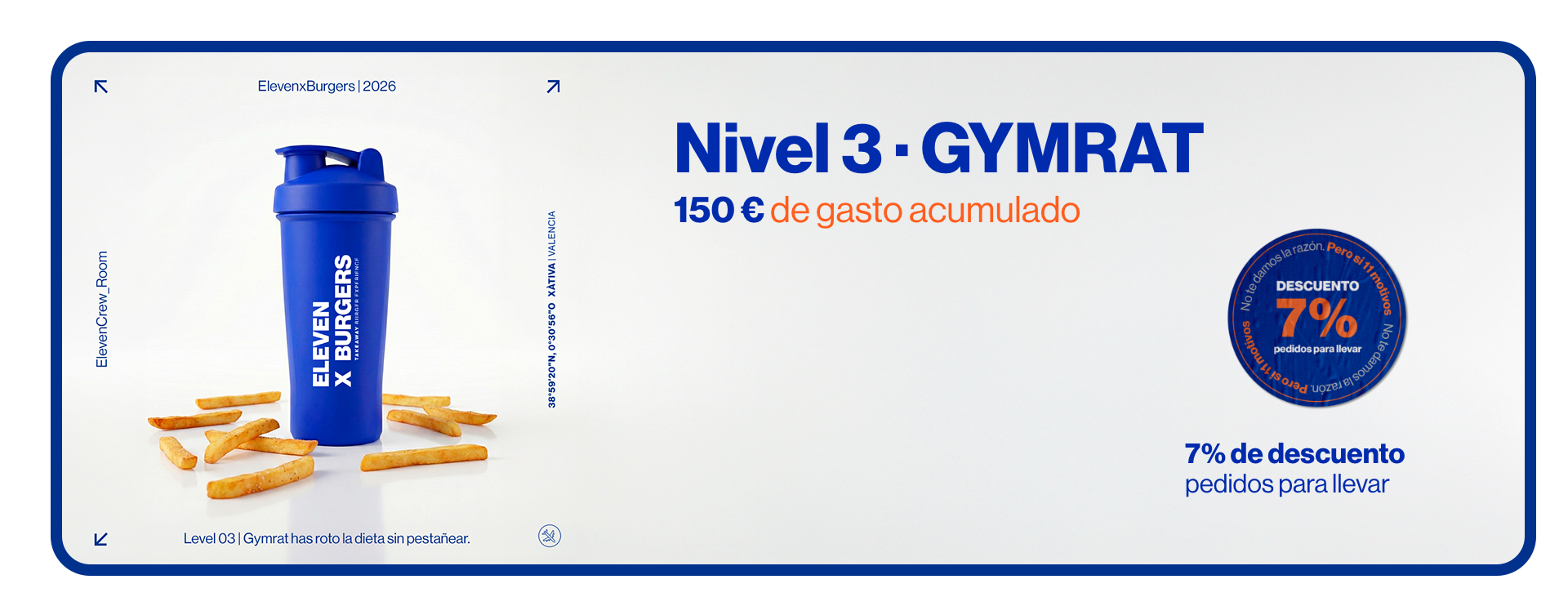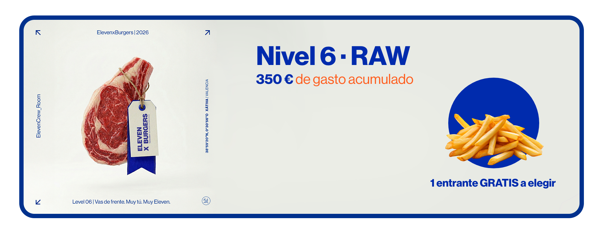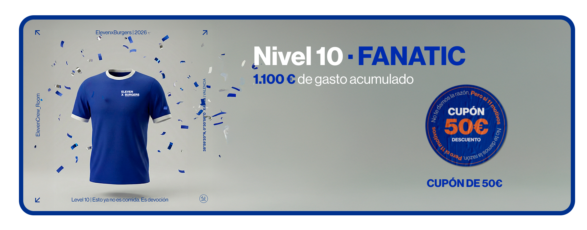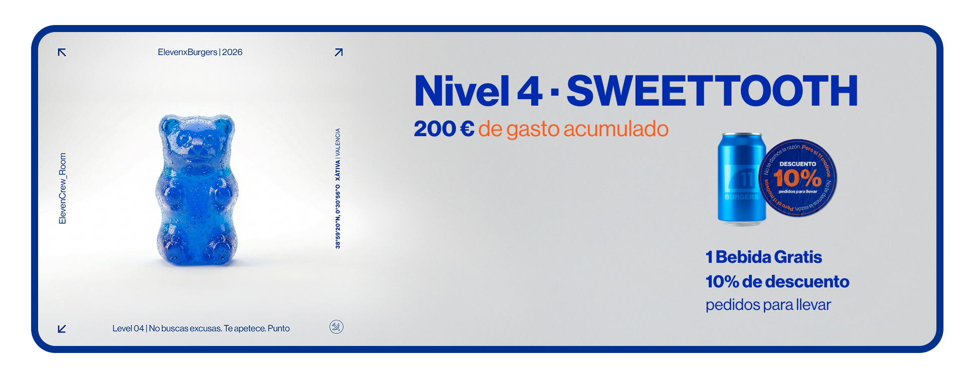 Promociones sujetas a condiciones según nivel y disponibilidad. No acumulables con otras ofertas, descuentos o promociones activas. ElevenxBurgers se reserva el derecho a modificar, suspender o cancelar las condiciones del programa ELEVEN CREW ROOM sin previo aviso.