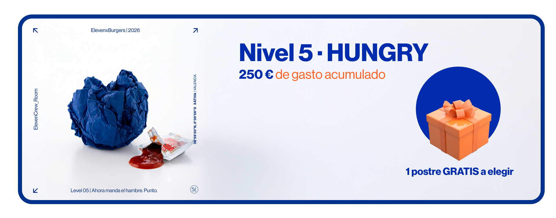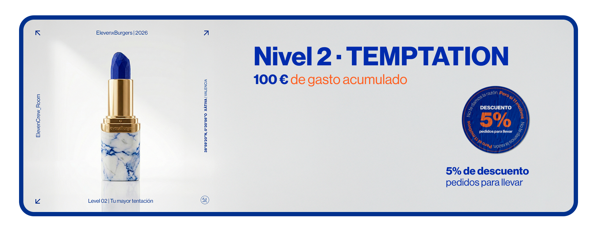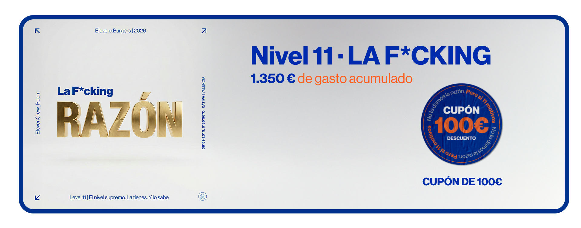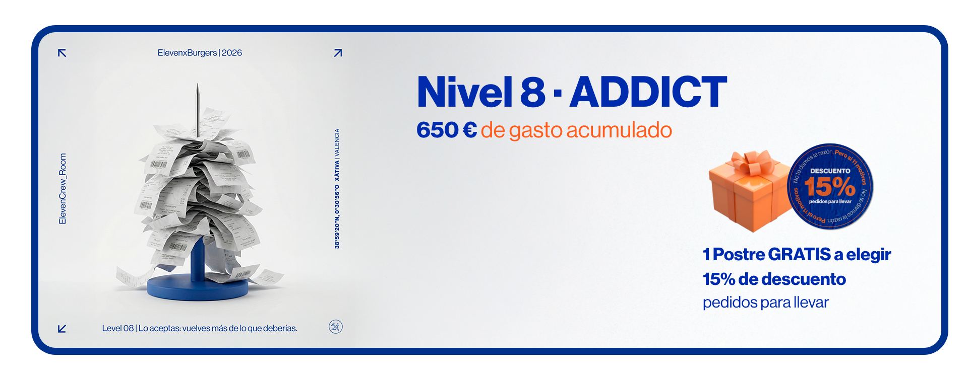 Promociones sujetas a condiciones según nivel y disponibilidad. No acumulables con otras ofertas, descuentos o promociones activas. ElevenxBurgers se reserva el derecho a modificar, suspender o cancelar las condiciones del programa ELEVEN CREW ROOM sin previo aviso.